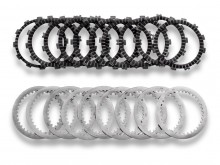 Clutch disc kit featuring aluminum-supported friction discs and high-performance steel plain discs. The friction material provides superior characteristics compared to OEM stock discs, ensuring greater durability, enhanced performance, and a more responsive feel in all riding conditions.