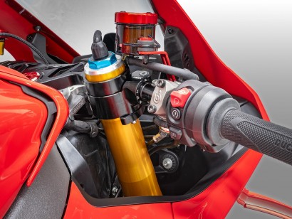 - Punto di leva laterale al fodero della forcella: migliora il feeling diretto con l’avantreno, garantendo una guida più reattiva, come nelle competizioni MotoGP.